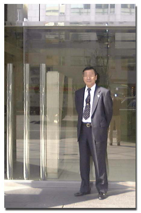押せば−事務所ビル前に立つ弁護士五右衛門−登場!!